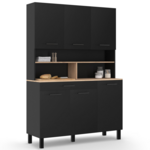 Buffet de cuisine 120 cm CINA 6 portes + tiroir noir et plateaux façon hêtre