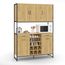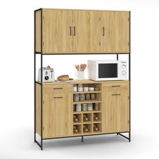 Chaque placard est équipé d'une étagère réglable sur 3 niveaux et pouvant supporter jusqu'à 15 kg. Les placards du bas sont surmontés par un tiroir de L.35,5 x H.9,5 cm, où vous pourrez organiser le rangement de vos couverts ainsi que de vos louches, fouets, couteaux de cuisine, etc.Le centre du meuble de cuisine est constitué d'un compartiment pouvant accueillir 6 bouteilles et de 3 niches recouvrant le plan de travail, situé à 83 cm du sol. Il vous offre la possibilité de ranger des éléments de décoration comme un cadre photo, un petit vase ou même votre micro-ondes. Ce meuble de cuisine DETROIT est également composé de 3 placards hauts : un placard de 2 portes de L.73,5 cm et le deuxième à droite de L.38,5 cm, qui accueilleront vos aliments ou vos verres les plus fragiles. À vous de choisir l'agencement de votre meuble de cuisine ! Grâce à son look industriel, en panneaux de particules mélaminés et métal noir, vous pourrez l'intégrer dans tous styles de décoration, dans votre cuisine ou votre cellier. Profitez en pour apporter une note tendance à votre intérieur ! Faites-vous plaisir et choisissez le meuble pratique et esthétique pour votre cuisine. Plus qu'un simple meuble de rangement, le buffet de cuisine DETROIT vous permet de stocker et de garder à portée de main tout le nécessaire de votre cuisine. Dimensions du buffet de cuisine 120 CM DÉTROIT Dimensions globales : Longueur 120 cm x largeur 40 cm x Hauteur 176,5 cmDimensions des placards bas : L.36 x l.37,5 x H.53,5 cmDimensions du placard haut gauche : L.73,5 x l.37,5 x H.53 cmDimensions du placard haut droit : L.38,5 x l.37,5 x H.53 cm Dimensions intérieures des tiroirs : L.31 x l.35 x H.6 cm Dimensions des niches bas : L.39,5 x l.37,5 x H.11,7 cmDimensions d'un compartiment à bouteilles : L.12,3 x H.12,3 cmHauteur du sol de l'espace de stockage : 83 cmEspace centrale : L.120 x l.40 x H.35,5 cm4 étagères réglables 3 positionsPoids supporté par étagère : 15 kg Hauteur des pieds : 13 cmMatériaux : panneaux de particules mélaminés 15 - portes en PB 12 mmStructure en métal 16 x 16 mmColoris : effet bois et métal noirÀ monter soi-même Retrouvez l'ensemble de nos éléments de cuisine sur notre boutique en ligne !