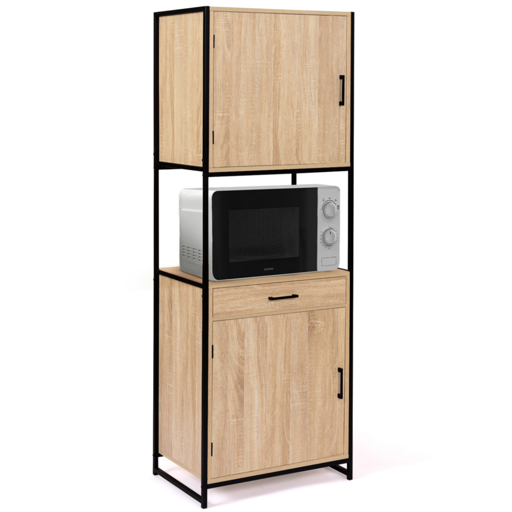 Profitez sans plus attendre d'un rangement optimisé et esthétique pour votre cuisine grâce au buffet de cuisine DETROIT de 60 cm ! À la fois pratique et fonctionnel, ce meuble de 60 cm de largeur vous permettra de stocker votre vaisselle ou vos aliments dans un buffet au design industriel tendance. Grâce à ses 2 placards ainsi qu'à son tiroir, vous bénéficiez d'une grande capacité de rangement. Utilisez le placard du bas pour stocker vos assiettes, poêles, casseroles et autres ustensiles de cuisine. Son étagère centrale supporte maximum 15 Kg et est ajustable sur 3 hauteurs différentes.Optimisez vos rangements grâce au tiroir situé juste au dessus du meuble bas. Idéalement situé sur la structure du buffet, ce tiroir vous permet de stocker vos couverts comme vos louches, couteaux de cuisine ou torchons. Cette structure basse est surmontée d'un plan de travail située à 76,5 cm du sol. Vous disposez d'un large espace de rangement de 35.5 cm de hauteur pour entreposer un micro-ondes, comme vos livres de cuisine ou de la décoration. La partie haute du buffet est équipée d'un second placard, utile pour accueillir vos aliments ou vos verres les plus fragiles. À vous de choisir l'agencement de votre meuble de cuisine ! Grâce à son look industriel associant plaque en effet bois et métal noir, vous pourrez facilement intégrer votre nouveau buffet de cuisine avec le reste de votre décoration ! Vous pouvez aussi associer le buffet de 60 cm avec celui de 80 ou de 120 cm de la même collection pour une pièce harmonieuse et encore plus ordonnée ! N'hésitez plus et profitez dès maintenant du meuble de cuisine pratique et esthétique !Dimensions du buffet de cuisine 60 CM DETROIT Dimensions globales : Longueur 60 cm x largeur 40 cm x Hauteur 176.5 cmDimensions du placard bas : L. 54 x l. 37,5 x H. 54 cm Dimensions intérieures du tiroir : L. 49 x l. 35 x H. 7,5 cm Hauteur du sol de l'espace de stockage central : 83 cmEspace central : L. 60 x l. 40 x H. 35,5 cm2 étagères réglables 3 positionsPoids supporté par étagère : environ 15 kg Hauteur des pieds : 13 cmMatériaux : panneaux de particules mélaminés 15 mm - portes en PB 12 mmStructure en métal 16 x 16 mmColoris : effet bois et métal noirÀ monter soi-même Découvrez le buffet de cuisine DETROIT en 80 cm et en 120 cm.Retrouvez également l'ensemble de nos éléments de cuisine sur notre boutique en ligne !