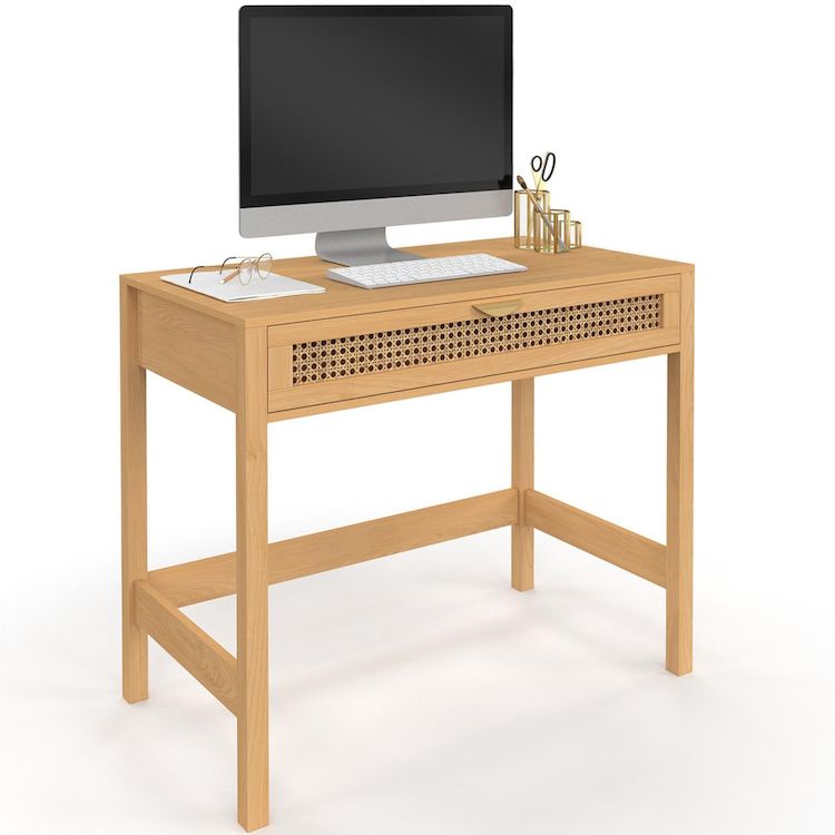 Laissez-vous séduire par le bureau 1 tiroir EDHEN effet cannage, un meuble alliant design, praticité et naturel.Son plateau effet bois et sa façade en cannage apportent chaleur et authenticité à votre décoration, quel que soit l'espace où vous l'installez, chambre, salon ou coin bureau.Doté d'un grand tiroir subtilement intégré sous le plateau, ce bureau offre un espace de rangement idéal pour vos accessoires du quotidien : carnets, stylos, câbles ou petits appareils.Grâce à son format compact de 90 cm, il s'intègre facilement dans toutes les pièces, même les plus restreintes, tout en garantissant un confort d'utilisation optimal.Sa structure en panneaux de particules et sa façade en cannage synthétique assurent robustesse et durabilité au quotidien. Le bureau EDHEN combine ainsi élégance et fonctionnalité pour créer un coin travail à la fois pratique et plein de charme.Craquez pour ce petit bureau bois bohème et tendance, qui saura sublimer votre intérieur tout en vous offrant un espace de travail agréable !Dimensions du bureau EDHEN 1 tiroir bois et cannageDimensions globales : Longueur 90 cm x largeur 50 cm x Hauteur 75 cmDimensions façade tiroir : L. 82 x l. 11,8 cmDimensions intérieures : L. 78 x l. 28,5 x H. 7 cmMatériaux : panneaux de particules de bois (PB) et cannage synthétiqueColoris : bois naturelÀ monter soi-mêmeRetrouvez l'ensemble de notre collection cannage sur notre boutique en ligne !
