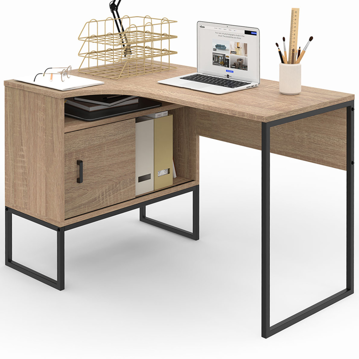 Bureau d'angle ROB façon hêtre et noir niche de rangement et porte design industriel