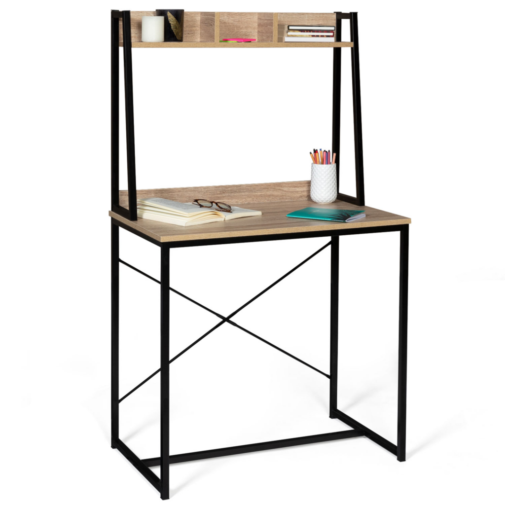Descriptif du bureau étagère droit DETROIT design industrielFaites place au style industriel avec le bureau étagère droit DETROIT bi-matière en bois et métal. Ses lignes sobres et son style épuré donneront à votre intérieur un aspect loft du meilleur effet !Avec son coloris bois et ses matériaux bruts, votre bureau trouvera facilement sa place chez vous car vous pourrez l'intégrer à différents styles d'intérieurs en renforçant le côté loft ou en donnant un peu de chaleur à son design.Le bureau bois métal industriel est doté d'un plateau très pratique en particules de bois d'une longueur de 80 cm sur 48 cm de largeur. Il est optimal pour travailler confortablement, disposer vos pots à crayons, trier vos documents sans gêne et installer votre poste d'ordinateur sur l'espace de travail.Conçu tout en hauteur, ce bureau compact et gain de place s'intégrera aisément à une chambre ou un salon sans encombrer votre pièce !Fonctionnel, grâce à sa longue étagère en bois disposant de 3 niches vous pourrez facilement ranger vos fournitures de bureau, disposer vos objets de décoration favoris et laisser libre votre espace de travail sur le bureau !Le plateau de 1,5 cm d'épaisseur est soutenu par une structure métallique qui vous assure solidité et stabilité au quotidien. Laissez entrer le style industriel si tendance dans votre intérieur avec notre bureau bi-matière en métal et bois !Pratique et déco, ce meuble modernisera votre salon, chambre ou bureau et facilitera le rangement de votre espace de travail !Dimensions du bureau étagère droit DETROIT design industrielDimensions totales du bureau : Longueur 80 cm x largeur 48 cm x Hauteur 137 cmDimensions de l'étagère : Longueur 75 cm x Profondeur 12,5 cm x Hauteur 9,5 cmLongueur de chaque niche : 27 / 18 / 27 cmEspace entre le plateau et l'étagère : 51,5 cmHauteur rebord au fond du plateau : 6 cmHauteur plateau : 75 cmPlateaux en particules de bois : épaisseur 1,5 cmA associer par exemple avec nos chaises SARA noires.Découvrez également l'ensemble de nos bureaux ainsi que notre collection industrielle sur notre boutique en ligne !