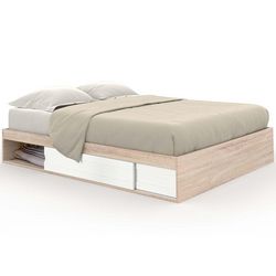 Cadre de lit double SALEM avec rangements et sommier 140 x 190 cm façon hêtre et blanc