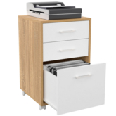 Le caisson de bureau JON avec support pour imprimante s'intégrera parfaitement dans votre coin bureau ou chambre à coucher !Le contraste esthétique entre la couleur bois de la structure et le coloris blanc de ses tiroirs habillera joliment votre intérieur. Ses 4 roulettes avec frein permettront de le déplacer en fonction des besoins.Astucieux et fonctionnels, 3 grands tiroirs fermés permettront d'organiser votre rangement pour un espace de travail bien rangé. Grâce à ses trois tiroirs, dont un avec rails pour vos dossiers suspendus, vos papiers seront cachés tout en les gardant à portée de main.Pratique et déco, rangez-y votre dossier, livres, fournitures et organisez votre espace plus facilement. La dimension du plateau bois d'une longueur de 43 cm est idéal pour recevoir une imprimante.Multifonction, il pourra aussi faire office de meuble d'appoint dans un salon pour y disposer vos objets de déco, petites plantes vertes ou de table de chevet dans une chambre.Stable et mobile, ses roulettes en plastique permettent de le déplacer facilement. Astucieux et pratique pour les petits espaces !Vous pourrez le mettre à côté d'un bureau, sous un bureau, ou en complément d'une étagère à niveaux !Dimensions du caisson de bureau JON avec 3 tiroirs Dimensions globales : Longueur 43 cm x largeur 40 cm x Hauteur 65 cmDimensions façade tiroirs supérieurs : L. 39.5 x H. 13 cmDimensions intérieures tiroirs supérieurs : L. 35.5 x l. 28.5 x H. 7.5 cmDimensions façade tiroir inférieur porte document : L. 39.5 x H. 30.5 cmDimensions intérieures tiroir inférieur porte document : L. 35.5 x l. 28.5 x H. 21.5 cmHauteur des roues : 5 cm4 roues avec freinMatériaux : Panneaux de particules de bois (PB) Coloris : Bois et blancÀ monter soi-mêmeRetrouvez également toute la collection de meubles contemporains sur notre boutique en ligne !