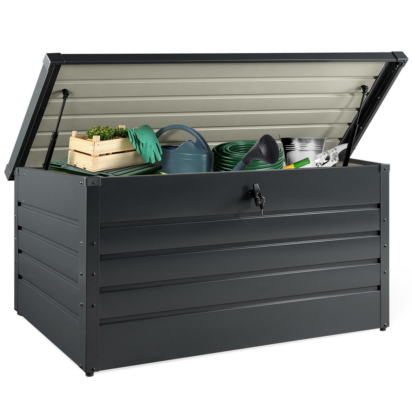 À la recherche d'une solution de rangement efficace pour remettre de l'ordre dans vos accessoires extérieurs ? Découvrez le coffre de rangement en métal verrouillable gris anthracite de 810 L. Bien plus résistant et esthétique qu'un coffre en plastique, le coffre en métal gris anthracite vous assure une protection contre la pluie et un maintien au sec ! Grâce aux dimensions de toit légèrement plus grandes que le bac, la pluie ne peut pas s'infiltrer. Ses 2 vérins à gaz permettent une ouverture et une fermeture facile du coffre. Pour une sécurité renforcée, le coffre est verrouillable, ainsi, vous pouvez le laisser en extérieur sans craindre les pillages. Ce coffre de jardin est idéal pour stocker des coussins, outils de jardin, jouets ou divers accessoires et objets volumineux grâce à ses larges dimensions.Entreposez votre bac sur votre terrasse, dans votre jardin ou dans votre garage. Grâce à sa couleur moderne, il s'accordera facilement avec vos autres éléments extérieurs.Dimensions du coffre de rangement en métal 810 LDimensions globales : Longueur 147 cm x largeur 86 cm x Hauteur 82 cmMatériau : acier galvaniséColoris : gris anthracite2 vérins à gaz2 clés fournies pour le verrouContenance : 810 LPoids : 29 kgÀ monter soi-mêmeCe coffre de rangement est disponible en 200 L, 350 L et 600 L.Retrouvez l'ensemble de notre gamme de rangements pour jardin sur notre boutique en ligne !