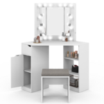 Coiffeuse d'angle ZELIA blanche 3 miroirs LED, 3 étagères, 1 tiroir, 1 caisson de rangement et tabouret