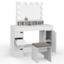 Coiffeuse ZELIA blanche miroir LED avec 4 niches, 5 tiroirs, 1 caisson de rangement et tabouret rembourré