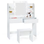 Coiffeuse ZELIA blanche table de maquillage 4 étagères, miroir LED et tabouret