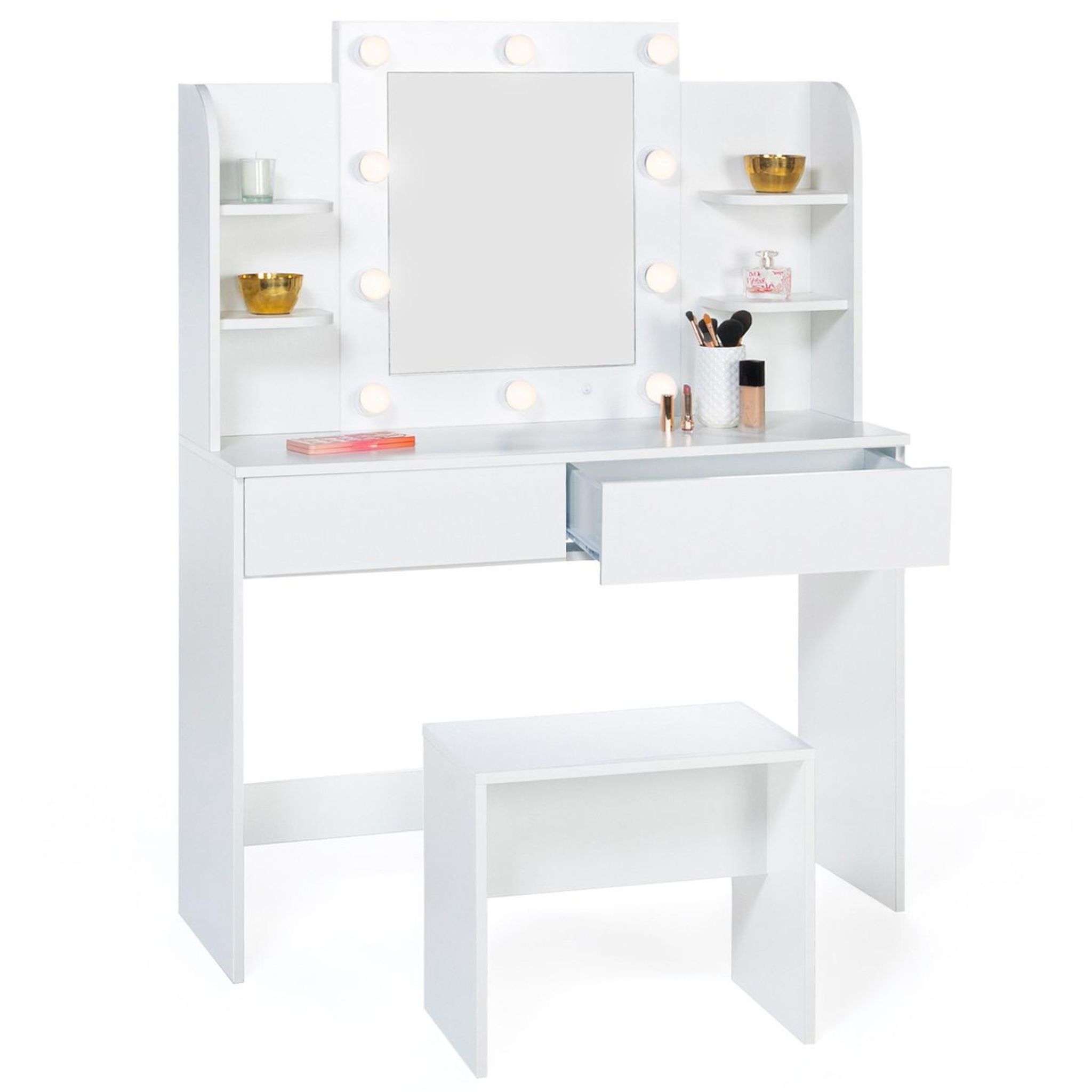Vous avez toujours rêvé d'une grande et belle coiffeuse, sobre et élégante, pour vous apprêter au quotidien ? Craquez pour la coiffeuse ZELIA et créez, chez vous, un espace digne des professionnels de beauté. Vous maquiller n'aura jamais été aussi facile ! Avec son miroir composé de 10 LEDS, soyez assuré d'avoir le teint parfait et un maquillage réussi en toute occasion.Fonctionnelle grâce à ses nombreux rangements, vous pourrez garder vos produits de beauté à portée de main. Ses 2 grands tiroirs vous permettront de ranger vos bijoux, palettes de maquillage et accessoires de coiffure. Terminé les affaires qui trainent, soyez assurés d'avoir toujours un espace coiffure et maquillage bien organisé. La coiffeuse dispose également de 2 étagères de part et d'autre du miroir de L.20 x l.15 cm afin que vous puissiez disposer tous vos vernis, pinceaux ou soins du quotidien. Vous pouvez également choisir d'y installer quelques éléments de décoration comme une plante, un petit cadre photo ou même une bougie pour un effet encore plus cocooning !La coiffeuse ZELIA est aussi composée d'un tabouret blanc assorti. Ajoutez-y un coussin moelleux en harmonie avec votre décoration intérieure et le tour est joué ! Vous êtes désormais assurée de passer vos séances beauté quotidiennes, en étant toujours confortablement installée.Faites-vous plaisir et craquez pour la coiffeuse ZELIA, et prenez soin de vous en toute sérénité.Dimensions de la coiffeuse ZELIA Dimensions globales : Longueur 108 cm x largeur 40 cm x Hauteur 141 cmDimensions du tabouret : L. 48 x l. 29,5 x H. 40,5 cmDimensions du miroir : L.42 x l. 48 cmNombre de LEDS : 10 LEDSNombre de tiroirs : 2Dimensions des tiroirs : L. 52 x l. 29 x H. 14 cm2 étagères de chaque côté du miroirDimensions des étagères : L. 20 x l. 15 cmEspace entre les étagères : 18 cmSe branche sur prise, interrupteur ON/OFFMatériaux : particules de bois (PB) - épaisseur 15 mmColoris: blancÀ monter soi-mêmeLa coiffeuse ZELIA existe également dans d'autres versions : - Coiffeuse ZELIA blanche 4 niches, miroir LED et tabouret- Coiffeuse ZELIA blanche 3 miroirs avec 4 niches et tabouretRetrouvez également l'ensemble de nos coiffeuses sur notre boutique en ligne !