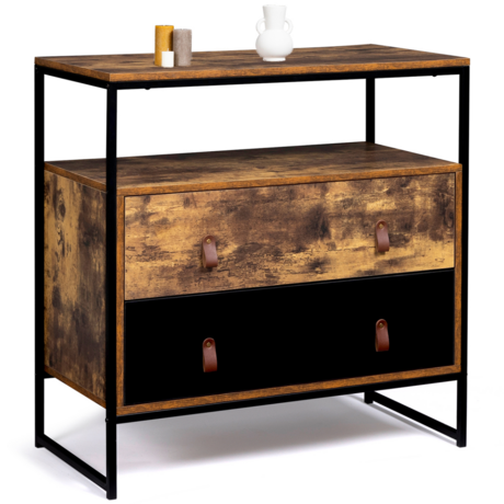 Envie de parfaire votre décoration industrielle avec une commode bi-matière bois vieilli et métal ? Découvrez cette jolie commode 2 tiroirs CHICAGO.Grâce à son style moderne et contemporain ainsi qu'à ses lignes sobres, la commode CHICAGO offrira à votre chambre, bureau ou dressing un esprit très factory . Composée de 2 grands tiroirs d'une hauteur de 19,5 cm, vous pourrez ranger et organiser vos vêtements tout en les protégeant de la poussière et de l'humidité. Esthétique, décorative et pratique, l'étagère supérieure offre également un espace de rangement et de déco. Vous pourrez y déposer un miroir, de petites plantes ou tout autre objet de décoration pour un intérieur aménagé avec goût. Une large niche centrale est également présente et vous permettra de ranger vos livres et autres bibelots ! Le format compact 80 x 40 cm de la commode et sa maxi capacité de rangement vous permettront de réaliser un véritable gain de place ! Ses pieds en métal lui assurent stabilité et robustesse, ainsi qu'un style industriel très tendance. Alors, n'attendez plus ! Apportez une touche industrielle à votre intérieur tout en optimisant votre espace de rangement avec la commode 2 tiroirs CHICAGO.Dimensions de la commode 2 tiroirs CHICAGODimensions globales : Longueur 80 cm x largeur 40 cm x Hauteur 80 cmDimensions intérieures des tiroirs : L.67 x l.33,5 x H.19,5 cmHauteur de la niche entre le tiroir supérieur et l'étagère : 18,5 cmColoris : bois vieilli et noir mat Matériaux : PB 15 mm / métal 16 x 16 mmÀ monter soi-même Pour compléter votre chambre dans une déco indus et chaleureuse, pensez à notre lot de 2 tables de chevets CHICAGO.Découvrez l'ensemble de notre collection industrielle sur notre boutique en ligne.