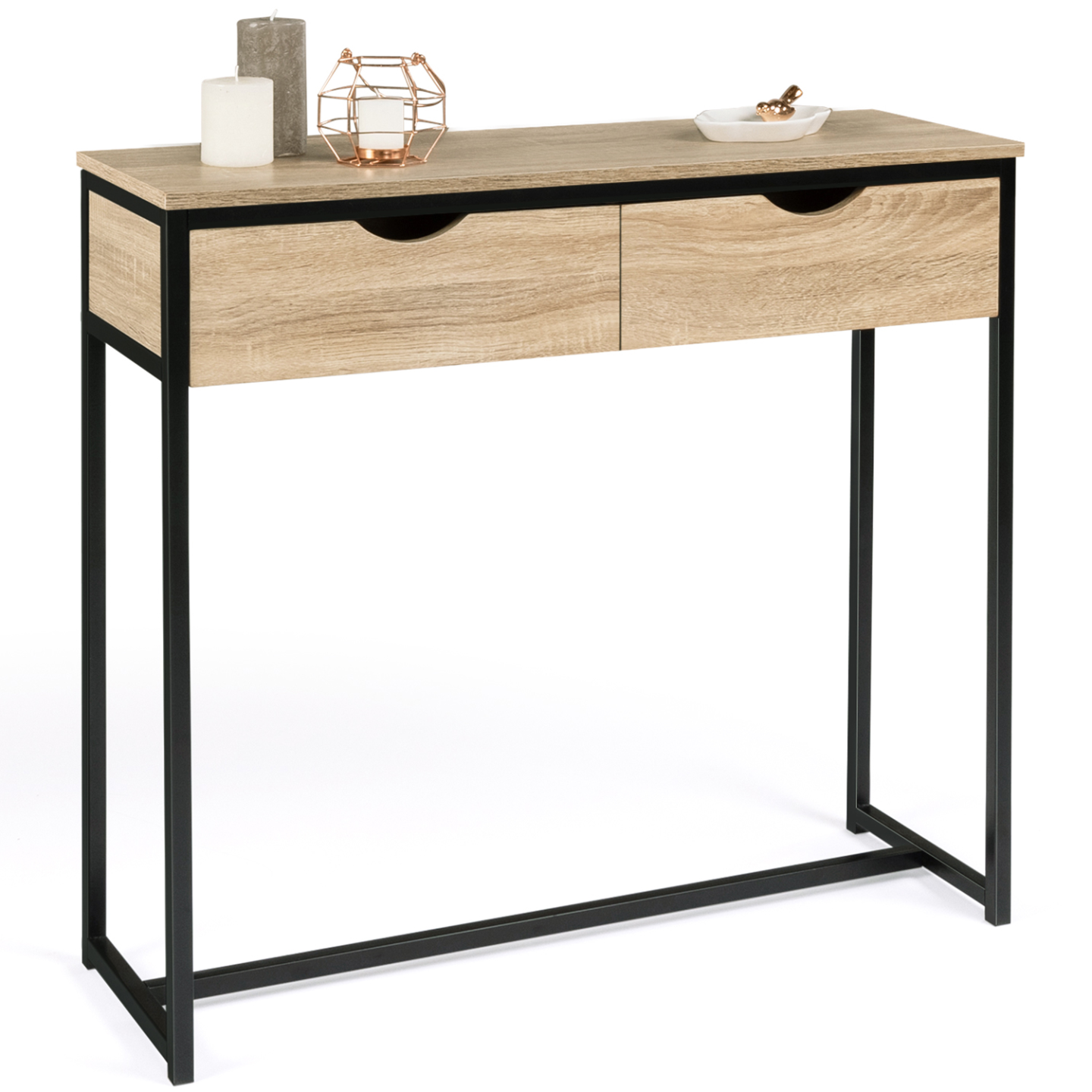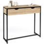 Descriptif de la console 2 tiroirs DETROIT design industrielLe style industriel et les lignes sobres bi-matière de la console 2 tiroirs DETROIT offriront à votre entrée, chambre, bureau ou salon un esprit factory ! De quoi réaliser une ambiance ultra chaleureuse et tendance !Esthétique, cette jolie console 2 tiroirs DETROIT au design industriel trouvera idéalement sa place dans les intérieurs urbains et contemporains, mais aussi plus rustiques.Ses 2 tiroirs vous offrent un espace de rangement fermé idéal pour vos effets personnels, qui sont gardés à l'abri des regards et de la poussière !Profitez du plateau supérieur pour vos objets déco : plantes vertes, vide-poches, vases, bougies, etc. Peu profonde, elle sera également parfaite utilisée comme meuble TV dans la chambre, pour créer un espace détente propice à l'endormissement ! Stable et robuste grâce à ses tiroirs et son plateau en particules de bois épaisseur et sa structure en métal noir, vous pourrez déposer tablette, lampe d'appoint, en toute sérénité.Son design sobre et ses couleurs naturelles lui donnent une allure élégante authentique et lui permettront de s'intégrer dans n'importe quelle pièce sans la surcharger.Sublimez dès maintenant votre intérieur avec la console 2 tiroirs DETROIT design industriel !Dimensions de la console 2 tiroirs DETROIT design industriel Dimensions globales : Longueur 90 cm x largeur 30 cm x Hauteur 80 cmDimensions des tiroirs : Longueur 42 cm x largeur 24 cm x Hauteur 14 cmPanneaux de particules de boisTubes en métalDécouvrez toute notre collection industrielle sur notre boutique en ligne !
