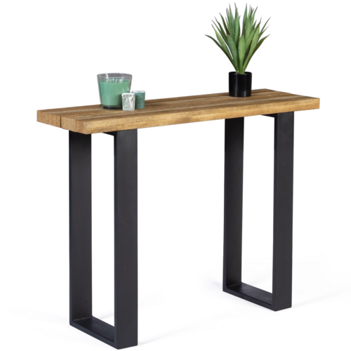 Descriptif de la console BLANCA plateau ajouré effet lattesInvitez le design industriel chez vous avec cette console tendance BLANCA plateau ajouré effet lattes. Ce meuble console bi-matière bois et métal au style industriel donnera un esprit factory à votre entrée, bureau, salon ou chambre !Moderne et design, ce meuble console BLANCA est composé d'un plateau en MDF de 3,8 cm fixé sur une structure en métal noir. Le plateau, en 2 parties, espacé d'un interstice à la manière d'une palette, apporte une touche d'originalité à ce meuble d'appoint !Astucieuse et fonctionnelle, les dimensions généreuses du plateau (Longueur 100 cm) sont spécialement conçues pour vous permettre d'y disposer toutes sortes d'objets de décoration : plantes, lampe, vide-poche.Multifonction, elle pourra aussi faire office de meuble d'entrée pour y disposer vos objets de déco, surplombée ou non d'un miroir.Peu profonde, elle sera également parfaite utilisée comme meuble TV dans la chambre, pour créer un espace détente propice à l'endormissement ! La couleur bois brut de son plateau et le noir de sa structure se fondront parfaitement dans votre décoration. Ses pieds originaux en forme de U assureront stabilité et robustesse à cette console.Laissez vous séduire par cette console de caractère à prix malin pour habiller votre intérieur !Dimensions du meuble console BLANCADimensions totales : Longueur 100 cm x largeur 30 cm x Hauteur 75 cmDimensions des pieds en métal : Longueur 8 cm x largeur 2 cmPlateau en MDF : épaisseur 3,8 cmPlateau en 2 parties façon lattes, espacées d'un interstice.Retrouvez tous nos modèles de consoles ainsi que nos collections industrielle et métal sur notre boutique en ligne !