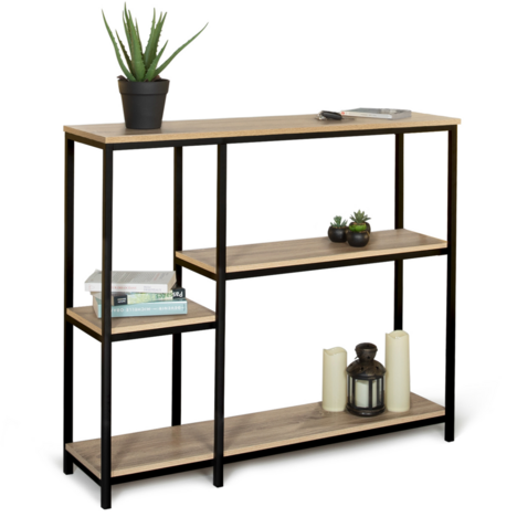 Descriptif de la console étagère bibliothèque DETROIT design industriel :Le style moderne, contemporain et les lignes sobres de l'étagère bibliothèque offriront à votre entrée, bureau ou salon un esprit factory !De quoi réaliser une ambiance ultra chaleureuse type loft, cosy et tendance !Esthétique, cette jolie console étagère bibliothèque DETROIT trouvera idéalement sa place dans les intérieurs urbains et contemporains, mais aussi plus rustiques.Les dimensions des deux plateaux sont spécialement conçues pour vous permettre d'y disposer tablette, lampe d'appoint, vase, petite plante verte. Servez-vous en idéalement comme petite bibliothèque d'appoint ou vitrine ouverte.Stable, authentique et robuste, avec ses quatre plateaux en particules de bois épaisseur et sa structure en métal noir elle arbore une allure élégante et élancée.Ses lignes légères, son design sobre et épuré, ses couleurs naturelles lui permettront de s'intégrer dans n'importe quel intérieur sans le surcharger.Multifonction, elle pourra aussi faire office de meuble d'entrée pour y disposer vos objets de déco, surplombée ou non d'un joli miroir.Ses différents plateaux pratiques et fonctionnels sont utiles pour y disposer un vide-poche dans une entrée, des livres, petites bougies ou autre objet.Pratique et déco, elle apporte une réelle valeur ajoutée à votre entrée ou séjour en les décorant et en les meublant en toute simplicité !Sublimez dès maintenant votre intérieur avec ses matériaux bruts, ses formes simples et l'alliance du bois et du métal pour un look authentique !Dimensions de la console étagère bibliothèque DETROIT design industriel :Dimensions globales hors-tout : L. 100 cm x l. 30 cm x H. 80 cmÀ fixer au mur pour éviter tout risque de basculementÀ monter soi-mêmeDécouvrez toute notre collection DETROIT sur notre site internet :Collection DETROIT