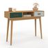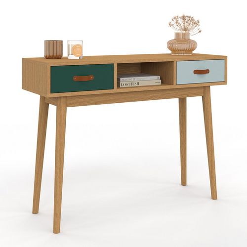 Originale et moderne, avec son design scandinave, la console ALIZE s'intégrera parfaitement dans votre entrée, bureau, séjour, ou chambre.Esthétique et harmonieux, le contraste entre le coloris bois clair de la console et de ses deux tiroirs verts assortis habillera joliment votre intérieur. Les deu