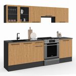 Cuisine complète 240 cm SUBTIL avec vitrine + plan de travail 7 éléments noir et façon hêtre