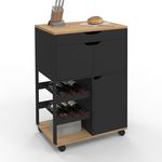 Votre cuisine manque d'organisation ? Maximisez votre espace grâce à la desserte de cuisine sur roulettes et ses multiples rangements ! Pratique, elle s'adapte à n'importe quel intérieur et possède de nombreux avantages.Ses deux niveaux range bouteilles et sa niche sont utiles pour stocker vos bouteilles. Mobile grâce à ses 4 roulettes, déplacez-la comme bon vous semble et gardez ainsi tous vos condiments à portée de main pendant que vous cuisinez.Dotée de 2 placards, elle offre un espace de rangement optimal pour tous vos ustensiles et provisions ! Profitez-en pour y entreposer toute votre vaisselle, vos torchons, conserves ou produits d'entretien. Ultra fonctionnel, ce meuble sur roulettes possède également un grand tiroir, parfait pour y ranger vos ustensiles de cuisine. Son large plateau supérieur vient compléter vos espaces de rangement et peut vous servir de plan de travail pour cuisiner. Esthétique, son côté bicolore bois noir et plateaux façon hêtre apporte une touche moderne et lumineuse à votre cuisine en un clin d'œil. Alors ne cherchez plus et combinez design et praticité grâce à notre nouvelle desserte COSY à roulettes noir et hêtre ! Dimensions de la desserte noire et plateaux façon hêtreDimensions totales : Longueur 60 cm x Profondeur 40 cm x Hauteur 85 cmDimensions façade du tiroir : L. 57 x l. 7,5 cmDimensions intérieures tiroir : L. 52,5 x l. 33,5 x H. 3,5 cmDimensions des portes doubles : L. 28,5 x H. 24 cmDimensions intérieures placard double : L. 57,5 x l. 38 x H. 24 cmDimensions de la porte simple : L. 27,5 x H. 43 cmDimensions intérieures placard simple : L.28 x l.38 x H. 43 cmHauteur entre les portes bouteilles : H. 11 cmHauteur par rapport au sol : 5 cmMatériaux : PB panneaux de particules de boisColoris : bois et blancÀ monter soi-mêmeVisserie incluse : ouiRetrouvez l'ensemble de nos meubles et éléments de cuisine sur notre boutique en ligne !