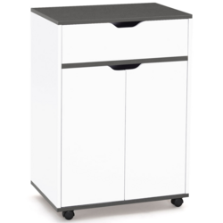 Découvrez notre desserte de cuisine COSY avec tiroir au design blanc et plateaux gris. Grâce à son grand placard et son tiroir, organisez tous vos condiments et denrées périssables, tout en les gardant à portée de main grâce à ses 4 roulettes directionnelles.Composée d'un large placard, empilez tout
