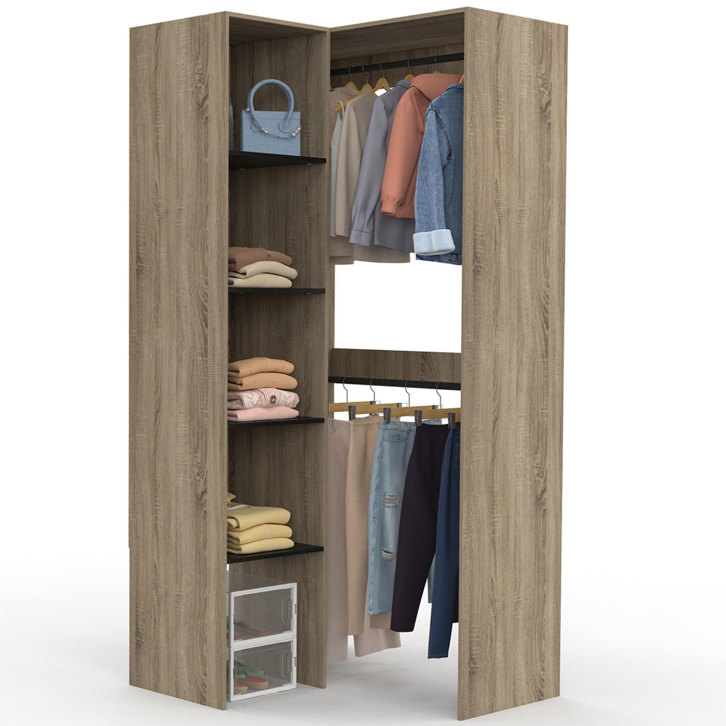 Dressing d'angle modulable L. 90 / 127 cm MELMAN double penderie + étagères bois et noir