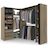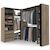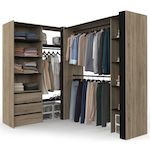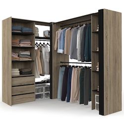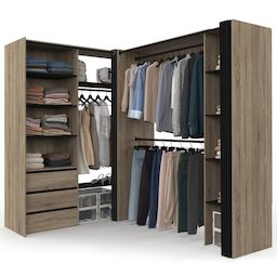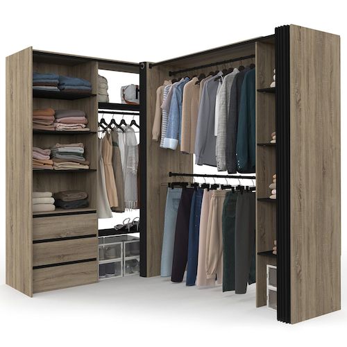 Dressing extensible d'angle MARLON 200 x 150 x 180 cm hêtre avec penderies + tiroirs + étagères + rideaux noirs