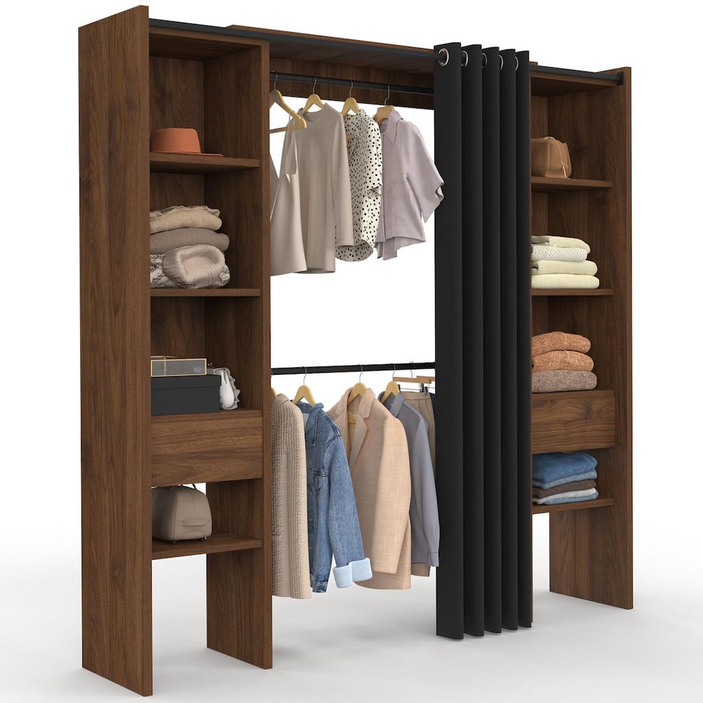 Dressing extensible double MERYL 120/180 x 50 x 180 cm noyer avec étagères + double penderie + rideau noir