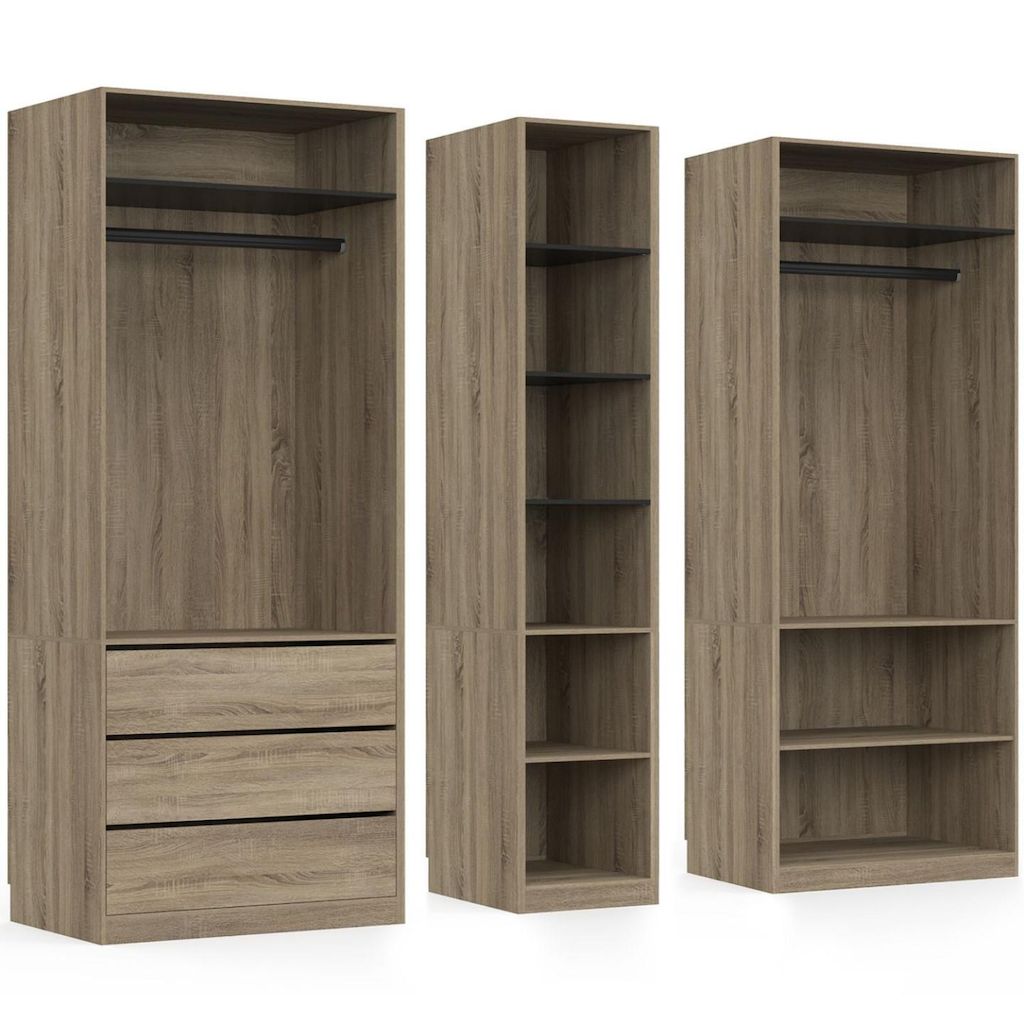 Dressing modulable TAYLOR 200 x 55 x 200 cm 3 modules avec penderies + étagères + tiroirs hêtre et noir