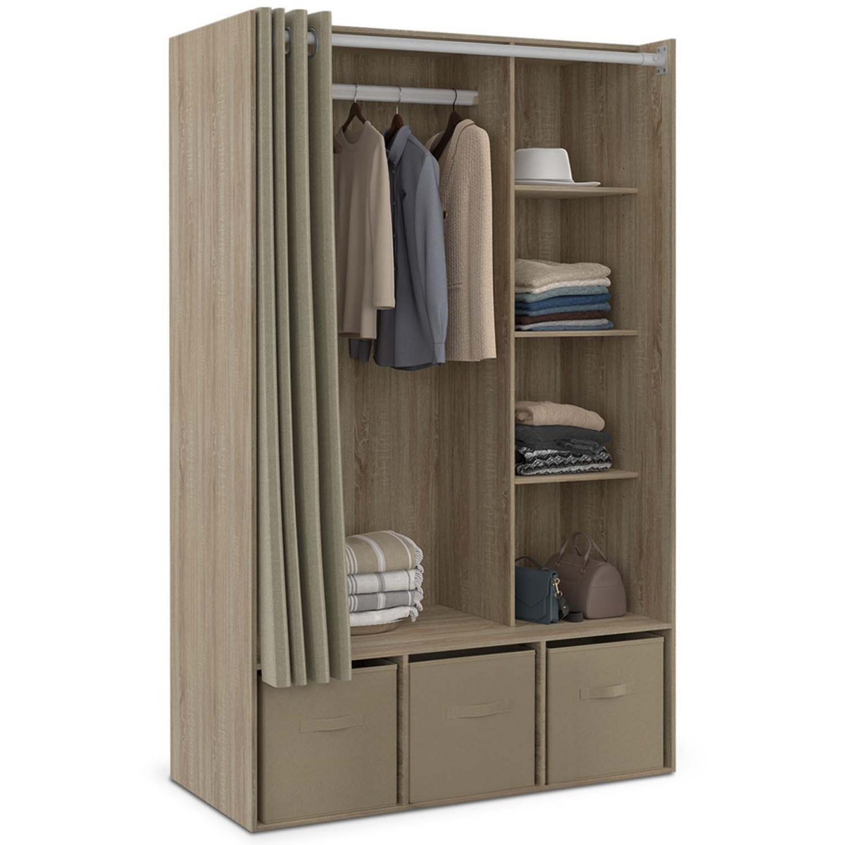 Dressing penderie DIANE 105 x 50 x 172 cm hêtre avec étagères + boites de rangement + rideau taupe