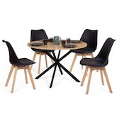 Vous désirez aménager votre salle à manger ou votre cuisine sans dépasser le budget ? Cet ensemble moderne composé d'une table à manger ALIX 110 cm et de 4 chaises noires SARA est fait pour vous !La table à manger ALIX et son plateau de diamètre 110 cm apporte un côté sophistiqué à votre intérieur. Profitez de votre repas en toute tranquillité, autour d'un apéro en famille, entre amis ou bien installez-vous avec votre ordinateur pour consulter vos mails.Sa forme ronde conviviale en fait une table à manger idéale pour partager des moments privilégiés avec vos proches tout en facilitant la circulation au sein de la pièce.Dotée d'une structure bi-matière avec son plateau bois et son pied araignée central en métal noir, c'est l'association idéale pour un look façon loft et un esprit chaleureux qui se mariera parfaitement avec votre décoration intérieure en y apportant une touche d'originalité.Tout aussi stable et robuste que la table ronde 110 cm, le lot de 4 chaises noires en polypropylène avec coussin rembourré et pieds en bois clair, offre un dossier flexible et une assise très confortable.Grâce à leur design simple et élégant, ces chaises scandinaves s'adaptent partout, elles sont idéales pour parfaire votre décoration et apporter modernité et simplicité qui plaira sans nul doute à vos convives.Alors n'hésitez plus et craquez pour cet ensemble table et chaises bois et noir à petit prix qui saura répondre à tous vos besoins !Dimensions de l'ensemble table ALIX et 4 chaises SARADimensions de la table : Longueur 110 cm x largeur 110 cm x Hauteur 76 cmLargeur du piètement : 95 cmPlateau coupé en 2Matériaux : panneaux de particules de bois (PB) et pieds en métalDimensions des chaises : Longueur 46 cm x largeur 51 cm x Hauteur 79,5 cmDimensions de l'assise : L. 46 x l. 40 x H. 45 cmMatériaux : assise en polypropylène et pieds en boisColoris : bois et noirÀ monter soi-mêmeRetrouvez l'ensemble de nos tables à manger industrielles ainsi que de nos chaises scandinaves sur notre boutique en ligne !