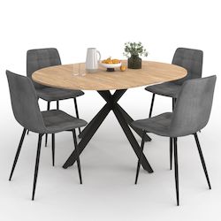 Donnez un esprit loft ultra moderne à votre intérieur grâce à la table à manger ronde ALIX extensible 110 - 150 cm en bois et métal noir ! Avec ses coloris sobres, elle s'adaptera parfaitement à toutes les décorations, qu'elle soit industriel ou moderne. Accueillez de 4 à 8 personnes grâce à sa rallonge pour partager de bons moments en famille ou entre amis ! Son pied araignée en métal noir lui apporte une touche d'originalité et de modernité, tandis que son plateau de diamètre 110 cm donnera un coté chaleureux et authentique à votre intérieur. La table industrielle est dotée d'une extension de 40 cm pour passer d'un plateau de 110 cm à 150 cm en un rien de temps. Sa forme ronde en fait une table à manger idéale pour partager des moments privilégiés avec vos proches tout en facilitant la circulation au sein de la pièce. Les 4 chaises MILA en velours gris foncé apporteront une touche contemporaine et cosy à votre salle à manger et assureront confort et style pour tous vos repas ! Grâce à leur assise en velours matelassé et leur dossier de 45 cm de hauteur qui vous garantira un bon maintien du dos, vous serez installé confortablement et pourrez profiter de bons moments conviviaux. Les 4 pieds en métal noir mat leur assurent robustesse et stabilité, tout en soulignant un look moderne et design. Il ne vous reste plus qu'à vous installer confortablement autour de la table et de profiter d'un moment entre amis ou en famille ! Dimensions de l'ensemble table ronde ALIX + 4 chaises MILA Dimensions globales de la table : Longueur 110/150 cm x largeur 110 cm x Hauteur 76 cmDimensions de l'extension : L.40 x l.110 cm Coloris : bois et noirCapacité : 4 à 8 personnesDimensions globales d'une chaise : Longueur 46 cm x largeur 55 cm x Hauteur 88 cmDimensions de l'assise : L.46 x l.41 x H.45 cmPieds en métal noir mat Revêtement de l'assise : velours grisVendues en lot de 4A monter soi-mêmeRetrouvez l'ensemble de nos tables à manger, de nos chaises et de nos ensembles sur notre boutique en ligne !