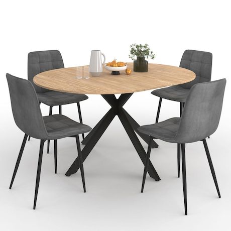 Ensemble table à manger ronde extensible ALIX 110 - 150 cm et 4 chaises MILA en velours gris foncé