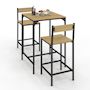 Vous aimez déjeuner sur le pouce, dans un esprit décontracté ? Profitez de la table haute de bar DETROIT et ses 2 tabourets avec dossier !Ce meuble bar de cuisine est très tendance et son esprit loft s'accorde parfaitement à son utilité : mangez rapidement autour de cette table mange-debout ou prenez le temps d'un dîner pour vous installer confortablement sur les chaises hautes. Moderne et pratique sont les maîtres-mots de cette table haute DETROIT au plateau en particules de bois. La couleur bois du plateau et de l'assise des chaises ainsi que le noir de la structure se fondront parfaitement dans votre décoration en apportant une touche industrielle très tendance.Stable et robuste, cet ensemble de bar et sa structure métal noir vous assurera stabilité tout en restant design ! Cette table et ses 2 sièges de bar sont idéaux si vous recherchez une table de bar à la fois design et gain de place.Alors n'hésitez plus et craquez pour ce meuble bar de cuisine pour 2 personnes à un prix irrésistible !Dimensions de la table haute DETROIT et 2 chaise de barDimensions de la table : Longueur 60 cm x largeur 60 cm x Hauteur 95 cmHauteur du repose-pieds : 18 cm Écart entre les pieds : 57 cm Dimensions des tabourets : L. 40 x l. 40 x H. 95 cm Dimensions de l'assise : 41 x 36 cm Hauteur du dossier : 28.5 cm Hauteur de l'assise : 67 cm Hauteur du repose-pieds : 16 cm Matériaux : Particules de bois mélaminé et métalColoris : Bois et métal noirÀ monter soi-même Retrouvez l'ensemble de notre collection industrielle sur notre boutique en ligne !