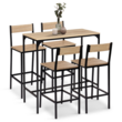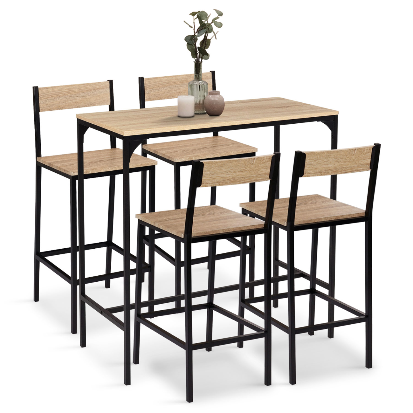 Vous aimez partager vos repas en famille ou entre amis, le tout dans un esprit décontracté ? N'hésitez plus et profitez de la table haute DETROIT et ses 4 chaises de bar pour accueillir vos convives.Ce meuble bar de cuisine est très tendance et son esprit loft s'accorde parfaitement avec son utilité : mangez rapidement autour de cette table mange-debout ou prenez le temps d'un dîner pour vous installer confortablement sur les chaises hautes de bar. Modernité et design sont les maîtres mots de cette table haute DETROIT au plateau en particules de bois (PB épaisseur 1,5 cm) et à la structure en métal noir. Stables et robustes, la table et ses 4 chaises de bar seront un élément central de votre cuisine ou salle à manger.Utilisez l'ensemble comme une table de cuisine dans l'esprit d'un îlot central, accompagnée de 4 chaises de bar, ou disposez le tout dans votre pièce à vivre pour un gain de place. La couleur bois du plateau et de l'assise des chaises hautes ainsi que le noir de la structure se fondront parfaitement dans votre décoration en apportant une touche industrielle très tendance.Cette table et ses 4 chaises de bar sont parfaites si vous recherchez une table de bar à la fois design et fonctionnelle. N'hésitez plus et profitez de ce meuble bar de cuisine pour 4 personnes à un prix irrésistible !Dimensions de la table haute DETROIT et 4 chaises de bar bois et métalDimensions globales de la table : Longueur 100 cm x largeur 60 cm x Hauteur 95 cmDimensions globales d'une chaise haute : L. 41 x l. 38 x H. 95 cmDimensions de l'assise d'une chaise haute : L. 41 x l. 36 cmHauteur d'assise : 67 cmHauteur du dossier d'une chaise haute : 29 cmHauteur du repose-pied : 15,5 cmMatériaux : panneau de particules de bois (PB) - épaisseur 1,2 cm et métal 2 x 2 cmCapacité : 4 personnesÀ monter soi-mêmeCet ensemble table haute et chaises de bar est également disponible en version tabourets.Retrouvez l'intégralité de nos tables hautes et toute notre collection industrielle sur notre boutique en ligne !