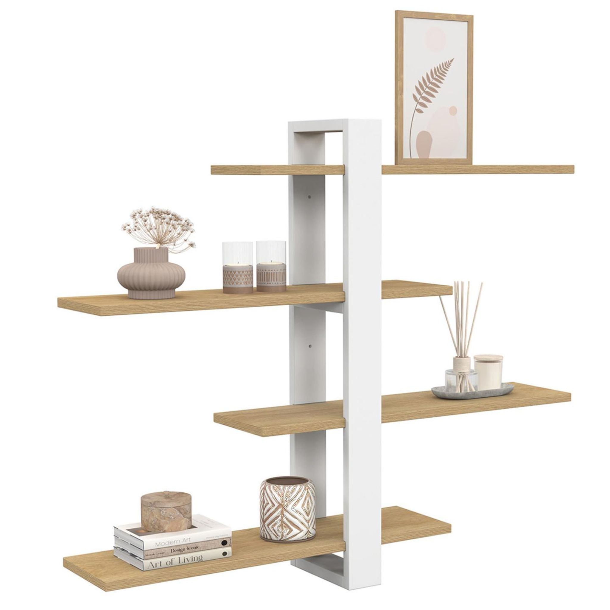 Laissez-vous séduire par notre étagère murale ORA 4 niveaux façon hêtre et blanc, au design moderne et modulable.Cette étagère murale est une solution de rangement élégante et astucieuse, idéale pour optimiser l'espace tout en apportant une touche déco moderne à vos murs.Son design épuré s'intègre parfaitement dans tous les styles d'intérieurs. Grâce à ses étagères coulissantes et amovibles, elle vous permet de personnaliser la disposition selon vos envies et vos besoins : parfaite pour exposer vos livres, objets décoratifs ou petites plantes.Pratique, elle offre 4 niveaux de rangement bien pensés qui allient fonctionnalité et esthétisme, tout en libérant de l'espace au sol. Son mélange de bois clair et de blanc apporte une touche à la fois chaleureuse et moderne idéale pour une ambiance tendance.Polyvalente, l'étagère ORA trouve facilement sa place dans le salon, la chambre, le bureau ou même l'entrée. Modulable, elle s'adapte à vos envies du moment et à votre style de décoration.Ne passez pas à côté de cette étagère murale ORA, un modèle original et pratique qui donnera du caractère et de la personnalité à votre intérieur !Dimensions de l'étagère murale ORA 4 niveaux façon hêtre et blancDimensions globales : Longueur 50 cm x largeur 15 cm x Hauteur 60 cm4 étagères amovibles : L. 50 x l. 13 x H. 1,2 cm Planche verticale : L. 5 x l. 15 x H. 60 cmEspace entre les étagères : 14.8 cm Matériaux : MDFColoris : Bois et blancÀ monter soi-mêmeRetrouvez l'ensemble de nos modèles d'étagères ainsi que notre collection moderne sur notre boutique en ligne !