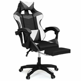2-en-1 le fauteuil gaming ALEX noir, blanc et gris sera l'allié de vos journées de télétravail et de vos soirées jeu ! Son design moderne s'associera facilement à une ambiance de gamer avec des lumières LED mais aussi à un intérieur plus contemporain ou industriel.Ce fauteuil de bureau est doté d'une assise large et confortable dont la hauteur est réglable de 44 à 54 cm ainsi que d'un dossier inclinable jusqu'à 135° pour s'ajuster au mieux à vos besoins et vous permettre de varier votre position au fil du temps. Réglez la hauteur et l'inclinaison de la chaise sans effort grâce aux deux leviers disposés sous l'assise !Le coussin appui-tête ainsi que le dorsal sont ajustables à la hauteur de votre choix pour soutenir votre tête et votre colonne vertébrale. Les accoudoirs vous permettront de conserver une position optimale pour vos bras.Le repose-pied télescopique se déplie en un clin d'œil pour vous offrir un moment de détente entre deux parties de jeu ou deux réunions ! Avec le dossier incliné et le repose-pied sorti, vous serez également très bien installé pour regarder un film ou une série ! Grâce au siège pivotant de cette chaise de bureau à roulettes, saisissez vos dossiers ou votre café sans avoir à vous lever !Son revêtement déperlant et ses coussins déhoussables sont faciles à nettoyer et ne craignent pas les tâches !N'attendez plus pour profiter du confort de la chaise de gaming-fauteuil de bureau ALEX !Dimensions fauteuil de gaming ALEXDimensions globales : Longueur 63 cm x largeur 62 cm x Hauteur 114 à 124 cmDimensions de l'assise : L. 51 x l. 49 x H. 44 à 54 cmHauteur du dossier : 78 cmDimensions des accoudoirs : L. 48 x l. 7 x H. 20 cm Dimensions du repose-pied : L. 32 x l. 20 cmDimensions de l'appui-tête : L. 28 x H. 18 cmDimensions du coussin dorsal : L. 31 x H. 20 cmAppui-tête et coussin dorsal ajustables et déhoussables5 rouesÀ monter soi-mêmeModèles également disponible en coloris noir et rouge, noir et bleu, noir et gris ainsi que noir et blanc.