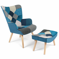 Fauteuil scandinave IVAR avec repose pieds en tissu patchwork et velours bleu