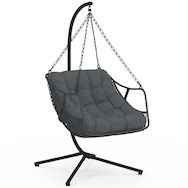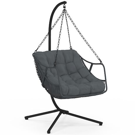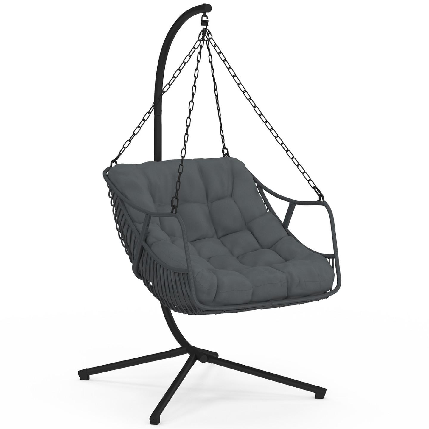 Accordez-vous un moment de détente dans ce fauteuil suspendu au design sobre et élégant et profitez de son mouvement de balancier pour vous reposer en toute tranquillité !Sa forme enveloppante est idéale pour adopter une position confortable, propice à la détente.Le fauteuil relax, avec son design tendance arrondi en résine tressée s'accordera aussi bien à votre décoration intérieure qu'extérieure. Fourni avec un socle, vous n'aurez pas besoin d'accrocher votre fauteuil au plafond. Son large pied en acier noir ainsi que les chaînes et le ressort qui l'accompagnent sont autant d'éléments qui vous assurent une bonne stabilité. Profitez ainsi du mouvement de balancier en toute sécurité.Ce socle vous permet également de déplacer votre fauteuil suspendu où bon vous semble en fonction des saisons et en profiter ainsi dans votre salon en hiver ou au bord de votre piscine en été. De plus, avec son coussin gris, ce siège ultra confortable deviendra rapidement un élément indispensable pour vos moments de détente. Robuste, ce fauteuil cocooning peut supporter un poids jusqu'à 100 kg. Dimensions du fauteuil suspendu relax LOA ajouré effet rotin et coussin grisDimensions globales : Longueur 100 cm x largeur 110 cm x Hauteur 200 cmDimensions de l'assise : L.86 x l.106 x H.51 cmDimensions du coussin : L. 80 x l. 80 x H. 15 cmDimensions du pied : L. 100 x l. 105 x H. 200 cmStructure en acierFauteuil en polyrotinCoussin en polyester grisÀ monter soi-mêmeRetrouvez également tous nos fauteuils de jardin disponibles sur notre boutique en ligne !