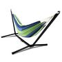 Laissez-vous séduire par le hamac avec support métallique et toile rayée bleue et verte !Profitez de ce véritable cocon pour vous détendre en toute tranquillité, vous accorder des moments de lecture ou des bains de soleil en toute sécurité dans votre jardin ou dans votre patio tout l'été !Léger et mobile, installez le hamac où bon vous semble, il ne nécessite pas de points d'accroche ! Recouverte d'une peinture époxy noire, sa structure tubulaire en acier est ajustable.Grâce à ses pieds anti-dérapants et espacés, son support vous offre une réelle stabilité et robustesse que vous apprécierez.Pratiques, ses 22 cordes de suspension, ses crochets et anneaux permettent de suspendre sûrement la toile et une répartition du poids optimale.Fabriquée à 35% de coton, 65% de polyester et 10% de viscose avec une densité de 300 g/m², sa toile vous apporte un véritable confort avec une surface de couchage de 200 cm (Longueur) x 150 cm (largeur).Facile à monter et à démonter. Possibilité de retirer la toile pour la nettoyer.Dimensions du hamac métal toile rayée bleue et verteDimensions globales : Longueur 270 cm x largeur 100 cm x Hauteur 100 cmDimensions toile : L. 200 x l. 150 cmLongueur de corde : 30 cmMatériaux : Acier et tissu (65% polyester – 35% coton)Coloris : Structure noire, toile rayée bleuPoids max : 120 kgPetit sac en tissu intégré pour ranger la toileModèles disponibles en différents coloris sur notre boutique en ligne :- Hamac avec support métal et toile rayée bleue et verte- Hamac avec support métal et toile rayée noire, blanche et chocolat