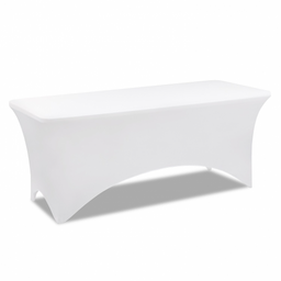 Fabriquée en tissu polyester et élasthanne 165 gr/m², cette housse blanche s'adapte à toutes les tables rectangulaires jusqu'à 180 CM de longueur.