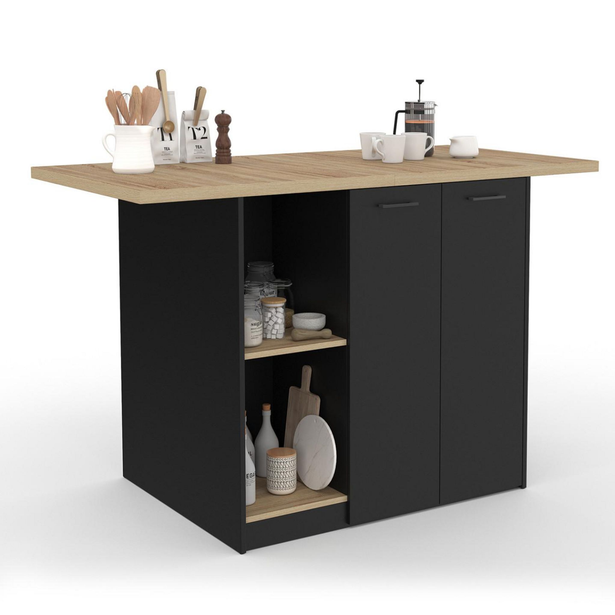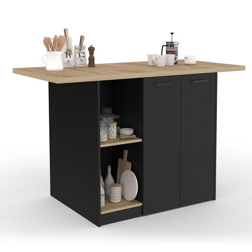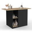 N'attendez plus et craquez pour cet îlot central noir et bois qui deviendra l'élément phare de votre pièce avec son allure à la fois chaleureuse et moderne !Avec ses dimensions généreuses, cet îlot propose un grand plan de travail de 3 cm d'épaisseur, parfait pour cuisiner ou bien partager un moment en famille ou entre amis autour d'un repas.Le côté bar offre un espace confortable et son plateau débordant permet d'y glisser des tabourets de bar, transformant ce meuble en un véritable espace repas ou coin snack, à la fois pratique et esthétique.Côté rangement, cet îlot ne manque pas de ressources : il dispose d'un grand placard fermé par 2 portes avec une étagère réglable sur trois hauteurs, parfait pour y stocker vaisselle, ustensiles ou provisions.Sur le côté, les 3 étagères latérales seront parfaites pour garder à portée de main les éléments du quotidien, ou pour y exposer vos livres de recettes, bocaux et accessoires déco.Sa structure en panneaux de particules et MDF lui apporte stabilité et robustesse.Pensé pour être pratique, fonctionnel et accueillant, cet îlot bicolore est la pièce idéale pour transformer votre cuisine en lieu de vie convivial et bien organisé.Dimensions de l'îlot central BAO 4 personnes bois noir avec plan de travail façon hêtreDimensions globales : Longueur 140 cm x largeur 70 cm x Hauteur 90 cmDimensions intérieur placard : L. 57 x l. 36,5 x H. 79 cm - avec étagère ajustable sur 3 positions Dimensions étagères latérales : L. 28,5 x l. 37 x H. 38,5 cmDébord du plan de travail : 25 cm de chaque côtéEspace pour les tabourets : 70 x 30 x 87 cmÉpaisseur du plan de travail : 3 cmMatériaux : Panneaux de particules mélaminés et MDF Coloris : bois et noirÀ monter soi-mêmeDécouvrez également l'ensemble de nos meubles et éléments de cuisine sur notre boutique en ligne !