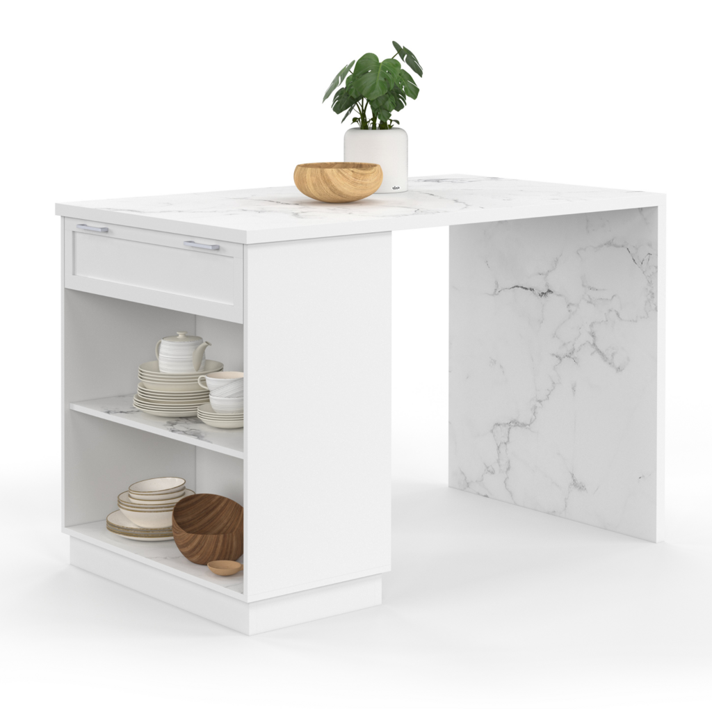 Ilot central mange-debout 4 personnes VITO 130 cm blanc et plateau marbre ALASKA