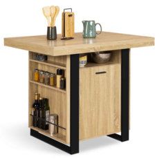 Optimisez et organisez l'espace de votre cuisine grâce à notre îlot central avec plan de travail et rangements intégrés au coloris bois façon hêtre et noir !Le look industriel et moderne de cet îlot central et ses couleurs sobres tout en contraste, lui permettent de s'adapter idéalement à tout type d'intérieur ! Il conférera un aspect net et rangé à votre cuisine !Son format généreux et néanmoins compact, peu encombrant, facilite la circulation tout en évitant les pas inutiles au quotidien dans votre pièce de vie. Il structure l'espace de votre cuisine ! Parfait pour les pièces de vie ouvertes et aérées.Avec son grand plateau 110 x 80 cm solide, cette table de bar vous offrira un plan de travail supplémentaire pour préparer de bons petits plats. Le plateau déborde de chaque côté de la structure centrale pour vous permettre de glisser en-dessous des tabourets de bar d'accueillir ainsi jusqu'à 6 personnes !Ultra fonctionnel, ce meuble de bar comporte de nombreux rangements. Un placard central qui s'ouvre de chaque côté vous permettra d'entreposer vaisselle, couverts et ustensiles de cuisine et d'y accéder facilement grâce à ses deux portes. Les 3 étagères seront parfaites pour garder à portée de main condiments, verres ou encore bouteilles. De quoi optimiser au maximum votre espace !Sa structure robuste en panneaux de particules de bois lui assure stabilité et robustesse pour un usage au quotidien !Tantôt coin repas, tantôt coin cuisine, avec sa triple fonction table haute de bar/plan de travail/meuble de rangement, il vous fera gagner du temps et de l'espace, et apportera un look contemporain à votre intérieur !Optez sans tarder pour cette installation tendance et conviviale à la fois fonctionnelle et décorative !Dimensions de l'îlot PHOENIX bois et noir avec rangementsDimensions globales : Longueur 110 cm x largeur 80 cm x Hauteur 90 cmDimensions façade porte : L. 47,5 x H. 58 cmDimensions intérieures du placard : L. 48 x l.58 x H. 57 cm avec étagère ajustable sur 3 niveauxDimensions niche centrale : L. 40 x l. 27,5 x Hauteur 20 cmDimensions étagères latérales : L. 56,7 x l. 9,5 x H. 18 / 18 / 40 cm (de haut en bas)Dimensions socle : L. 80 x l. 60 x H. 1,5 cmLargeur des pieds : 8 cmHauteur du sol : 8 cmMatériaux : panneaux en particules de boisÀ monter soi-mêmeProduit vendu seul, sans les tabourets.Modèle également disponible bois façon hêtre blanc.Retrouvez l'ensemble de nos meubles de cuisine sur notre boutique en ligne !