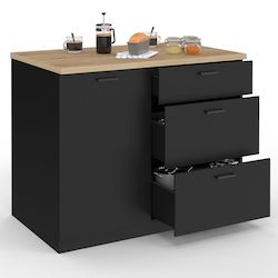 Ilot central TIBO 110 cm casserolier 3 tiroirs bois noir avec plan de travail façon hêtre