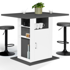 Optimisez et organisez l'espace de votre cuisine grâce à notre îlot central avec plan de travail et rangements intégrés au coloris en bois gris et blanc !Le look tendance de cet îlot central, ses lignes droites et épurées et ses couleurs sobres tout en contraste lui permettent de s'adapter idéalement à tout type d'intérieur ! Il conférera un aspect net et rangé à votre cuisine !Son format généreux et néanmoins compact, peu encombrant, facilite la circulation dans votre pièce de vie. Il structure l'espace de votre cuisine ! Parfait pour les pièces de vie ouvertes et aérées.Avec son grand plateau 110 x 80 cm solide (PB épaisseur 3 cm), cette table de bar vous offrira un plan de travail supplémentaire pour élaborer vos préparations. Le plateau déborde de chaque côté de la structure centrale pour vous permettre de disposer en-dessous des tabourets de bar et accueillir ainsi jusqu'à 6 personnes !Très fonctionnel ce meuble de bar comporte de nombreux rangements. Un placard central qui s'ouvre de chaque côté vous permettra d'entreposer vaisselle, couverts et ustensiles de cuisine et d'y accéder facilement grâce à ses deux portes. Sur le côté, les 3 étagères seront parfaites pour garder à portée de main condiments, verres ou encore bouteilles. De quoi optimiser au maximum votre espace !Sa structure robuste en PB (panneaux de particules de bois, épaisseur 1,5 cm) lui assure stabilité et robustesse pour un usage au quotidien !Tantôt coin repas, tantôt coin cuisine, avec sa triple fonction table haute de bar/plan de travail/meuble de rangement, il vous fera gagner du temps et de l'espace, et apportera un look contemporain à votre intérieur !Laissez-vous séduire par cet îlot pratique et fonctionnel aux couleurs sobres et élégantes !Dimensions de la table îlot de cuisine bois blanc et grisDimensions globales : Longueur 110 cm x largeur 80 cm x Hauteur 90 cmDimensions placard : L. 40 x l. 36,5 x H. 60 cmDimensions niche centrale : L. 40 cm x l.17 x H. 27 cmDimensions étagères latérales : L. 36 x l. 10 x H. 15,5 / 15,5 / 44 cm (de haut en bas)Dimensions socle : L. 80 x l. 60 x H.1,5 cmÉpaisseur plan de travail : 3 cmProduit vendu seul, sans les tabouretsÀ monter soi-mêmeModèle également disponible dans d'autres coloris : - Ilot central UGO 110 cm bois blanc et imitation hêtre avec rangements- Ilot central UGO 110 cm bois noir et imitation hêtre avec rangements design industriel- Ilot central UGO 110 cm effet béton et blanc avec rangements- Ilot central UGO 110 cm bois blanc et gris avec rangementsRetrouvez l'ensemble de nos meubles de cuisine sur notre boutique en ligne !