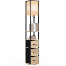Lampadaire industriel en bois noir avec étagères bois clair 3 tiroirs tissu UTAH et abat-jour carré blanc