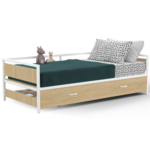 À la recherche d'une banquette convertible, à la fois esthétique et pratique ? Optez pour le lit gigogne DETROIT de 90 x 190 cm au coloris bois et blanc. Ce lit gigogne au style industriel et aux lignes épurées ne manquera pas d'apporter du caractère à votre intérieur, tout en offrant un couchage supplémentaire, grâce à son option gigogne. Couchage 2 en 1, cette banquette convertible est idéale pour une chambre d'amis, un appartement étudiant ou même dans votre salon en guise de banquette, en la plaçant contre un mur avec quelques coussins.Grâce à cette banquette convertible, vous pouvez optimiser l'agencement de la pièce : un lit 2 places une fois déplié et un lit indépendant ou banquette lorsque vous le repliez. Une solution gain de place qui ne risque pas d'envahir les petits espaces ! Le sommier du couchage principal se compose de 13 lattes et le sommier du couchage secondaire, 11 lattes. Pour déplier votre couchage, c'est très simple, il vous suffit de tirer sur le sommier du second couchage grâce à son système de roulettes et de déplier ses pieds. Vous bénéficiez ainsi d'un véritable lit double à compléter d'un matelas. Alors n'hésitez plus et craquez pour le lit gigogne DETROIT, la solution idéale pour optimiser l'espace de votre pièce !Matelas non vendu avec la banquette convertible.La banquette peut accueillir un matelas jusqu'à 25 cm d'épaisseur. Dimensions du lit gigogne DETROIT 90 x 190 cmDimensions globales du lit plié : Longueur 201 cm x largeur 95.5 cm x Hauteur 61 cmDimensions intérieures du lit principal : L. 195 x l. 92.5 cmCouchage lit plié : 90 x 190 cmDimensions globales du lit déplié : L.201 cm x l.194 cm x H.61 cmCouchage lit déplié : 180 x 190 cmHauteur des pieds : 29.5 cmDimension poignée : 9.5 cmNombre de lattes : 13Distance entre chaque latte : 10 cmÉpaisseur des lattes : 1.5 cmÉpaisseur bois rebords : 1.5 cmHauteur sommier : 31 cmDimensions banquette : L. 192.5 x l. 88.5 cm - 4 roulettesNombre de latte banquette : 11Matériaux : Particules de bois + métal Coloris : bois / blancVisserie incluseÀ monter soi-même : ouiCe lit banquette existe également en version bois et noir.Retrouvez également toute la collection de meubles industriels sur notre boutique en ligne !