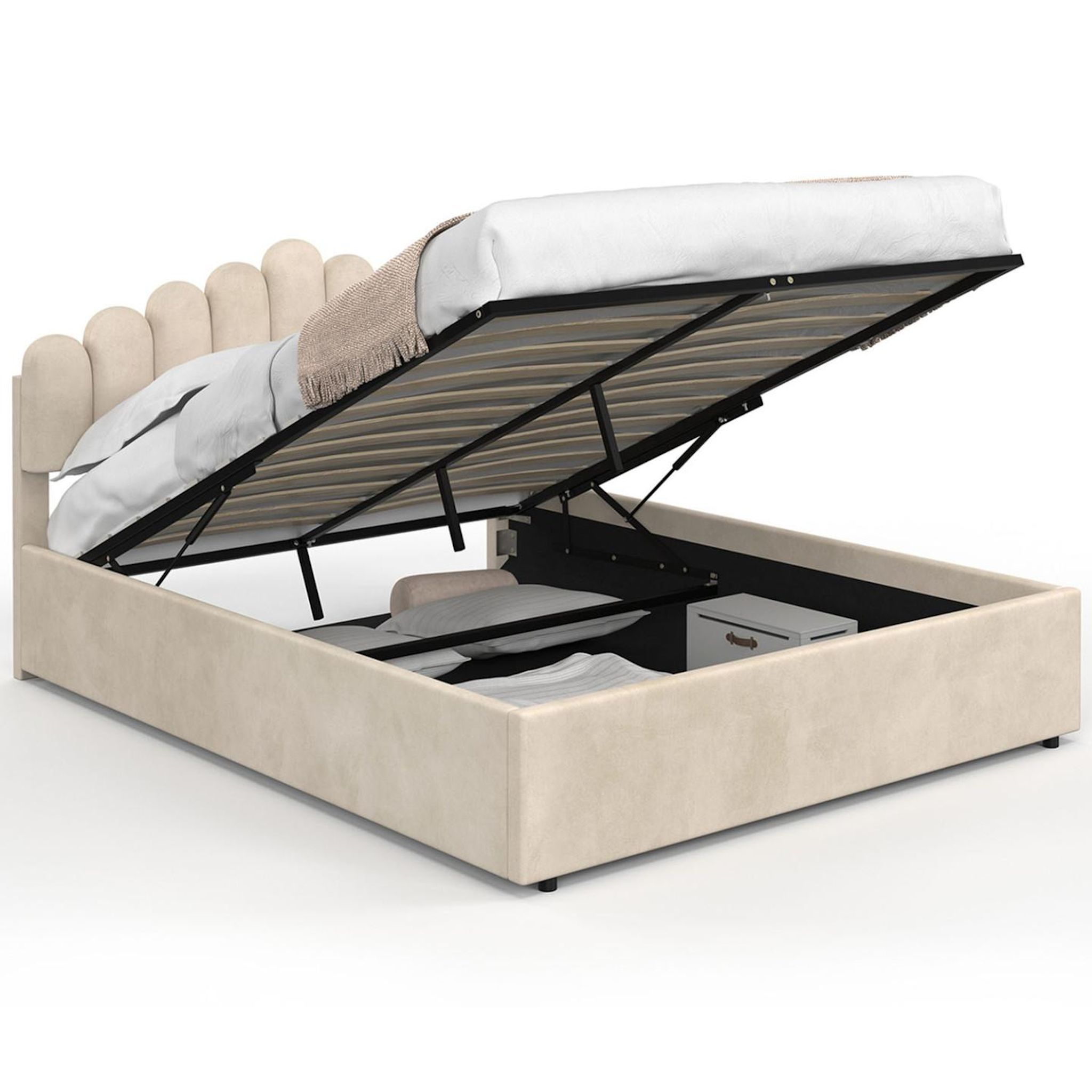 Adoptez le lit coffre double NOELIE 140 x 190 cm et apportez une touche de modernité et d'élégance à votre chambre à coucher ! Doté d'une grande et jolie tête de lit matelassée velours beige en forme de couronne, ce lit coffre double habillera élégamment votre mur et vous apportera tout le confort n