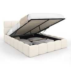 Lit coffre double NUAGE avec tête de lit matelassée et sommier 140 x 190 cm tissu bouclette blanc