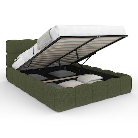 Adoptez le lit coffre double NUAGE 140 x 190 cm et apportez une touche de modernité et d'élégance à votre chambre à coucher ! Doté d'une grande et jolie tête de lit matelassée en bouclette vert kaki, ce lit coffre double habillera élégamment votre mur et vous apportera tout le confort nécessaire lor