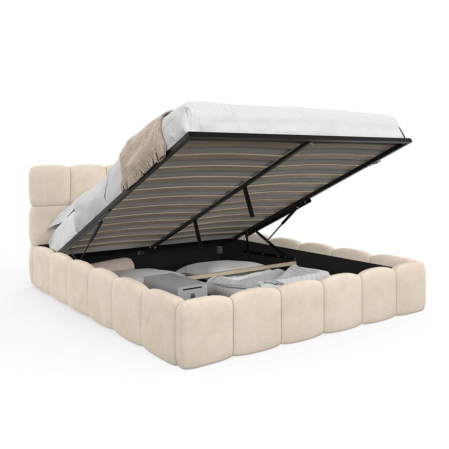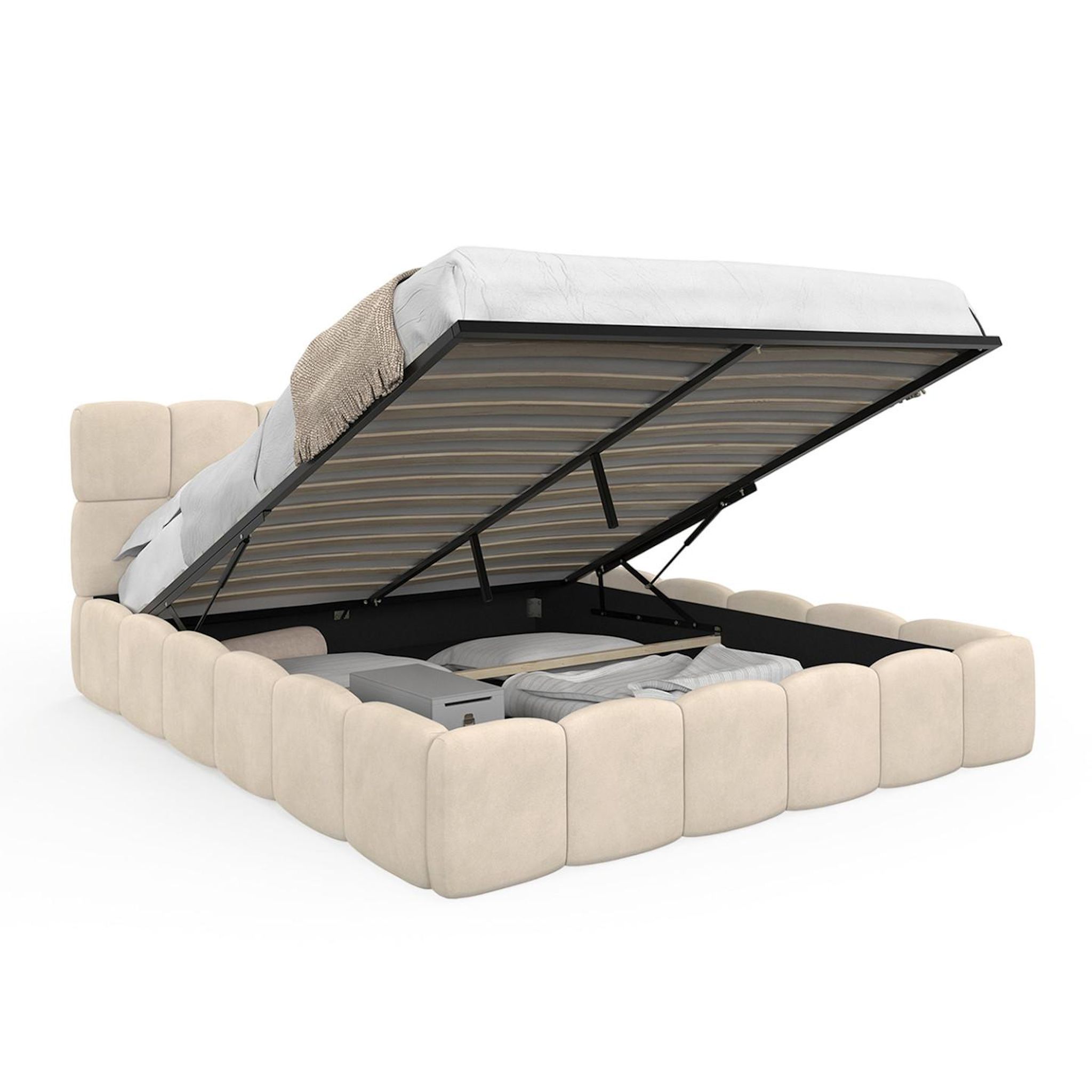 Lit coffre double NUAGE avec tête de lit matelassée et sommier 160 x 200 cm velours beige