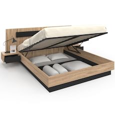 En savoir +Alliez praticité et design grâce à ce lit coffre SANTA 160 x 200 cm avec chevets intégrés, au coloris bois et noir. Grâce à son coloris bois et noir, votre lit se mariera parfaitement avec votre décoration intérieure, tout en donnant un peu de chaleur à votre intérieur. Très pratique, ce lit adulte dispose de 2 tables de nuit dotées chacune d'un tiroir , rangez-y vos objets du quotidien tels que votre livre préféré, vos mouchoirs ou tout autre objet que vous aimeriez avoir à portée de main. Utilisez le plateau supérieur de vos chevets pour installer votre lampe de chevet, votre réveil ou autre décoration. Sa taille de 160 x 200 cm conviendra parfaitement pour un matelas standard double. De plus, son sommier vous offrira un soutien optimal pour votre matelas et un meilleur confort pendant votre sommeil.De plus, ce lit abrite sous son sommier un grand coffre de rangement, très pratique et fonctionnel. Le coffre, de la dimension du lit, est facile à ouvrir et à fermer en un instant : le sommier est relevable en un tour de main grâce au mécanisme de vérins de levage. Doublement fonctionnel, vous pouvez y ranger draps, couettes, édredons, coussins et vêtements volumineux. Un gain de temps et d'espace ! Finis les oreillers empilés, laissez place à une chambre rangée en toute circonstance avec le lit SANTA et son rangement intégré. Pour apporter encore plus de confort, un appui-tête a été ajouté à la tête de lit et vous permettra d'être confortablement installé dans votre lit, pour un moment de détente ou de lecture. À la fois pratique et esthétique, ce lit coffre SANTA en panneaux de particules de bois saura trouver sa place dans votre chambre à coucher ou dans une chambre d'amis. N'attendez plus et optez pour ce lit coffre avec ses rangements et son sommier 160 x 200 cm inclus ! Dimensions du lit coffre SANTA avec tables de chevetDimensions globales : Longueur 245 cm x largeur 209 cm x Hauteur 90 cmHauteur du pied : 12 cm - renfoncement du pied de 5 cmHauteur du cadre : 18 cmHauteur totale du cadre : 30 cmDimensions de la tête de lit : L. 220 x H. 90 cmDimensions de l'appui-tête : L. 165 x l. 15 x H. 4 cmDimensions du chevet : L. 40 x l. 35 x H. 18,50 cmDimensions façade tiroir : L. 36 x H. 15 cm - encoche de 9 cmDimensions intérieures tiroir : L. 31 x l. 28 cmDimensions des lattes : l. 5 x H. 1 cmMatériaux : panneaux de particulesÀ monter soi-même