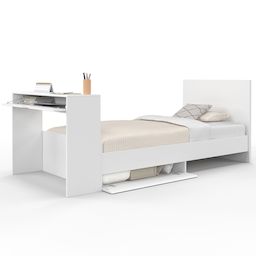 Lit simple OMAHA 90 x 190 cm avec sommier, tête de lit, bureau et rangements blanc
